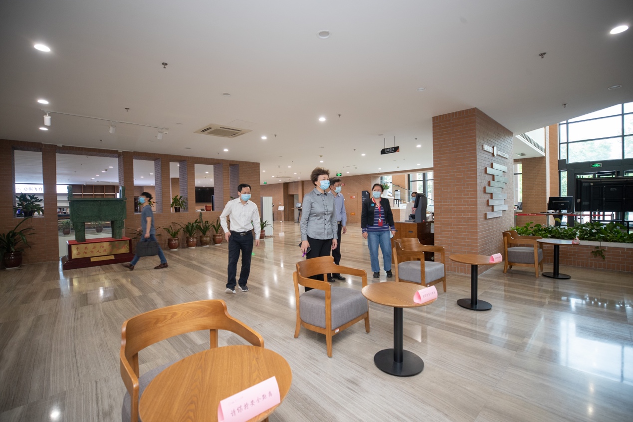 陈旭、李一兵对图书馆采取出入登记、检测体温、自助图书消毒等具体举措表示肯定,并强调,图书馆要加强馆内引导,避免出现交叉感染,防控意识和举措不能有丝毫松懈。要和相关部门统筹协调,整合空间、设备资源,加快建设虚拟学生活动中心,为师生提供更加便捷的服务。
