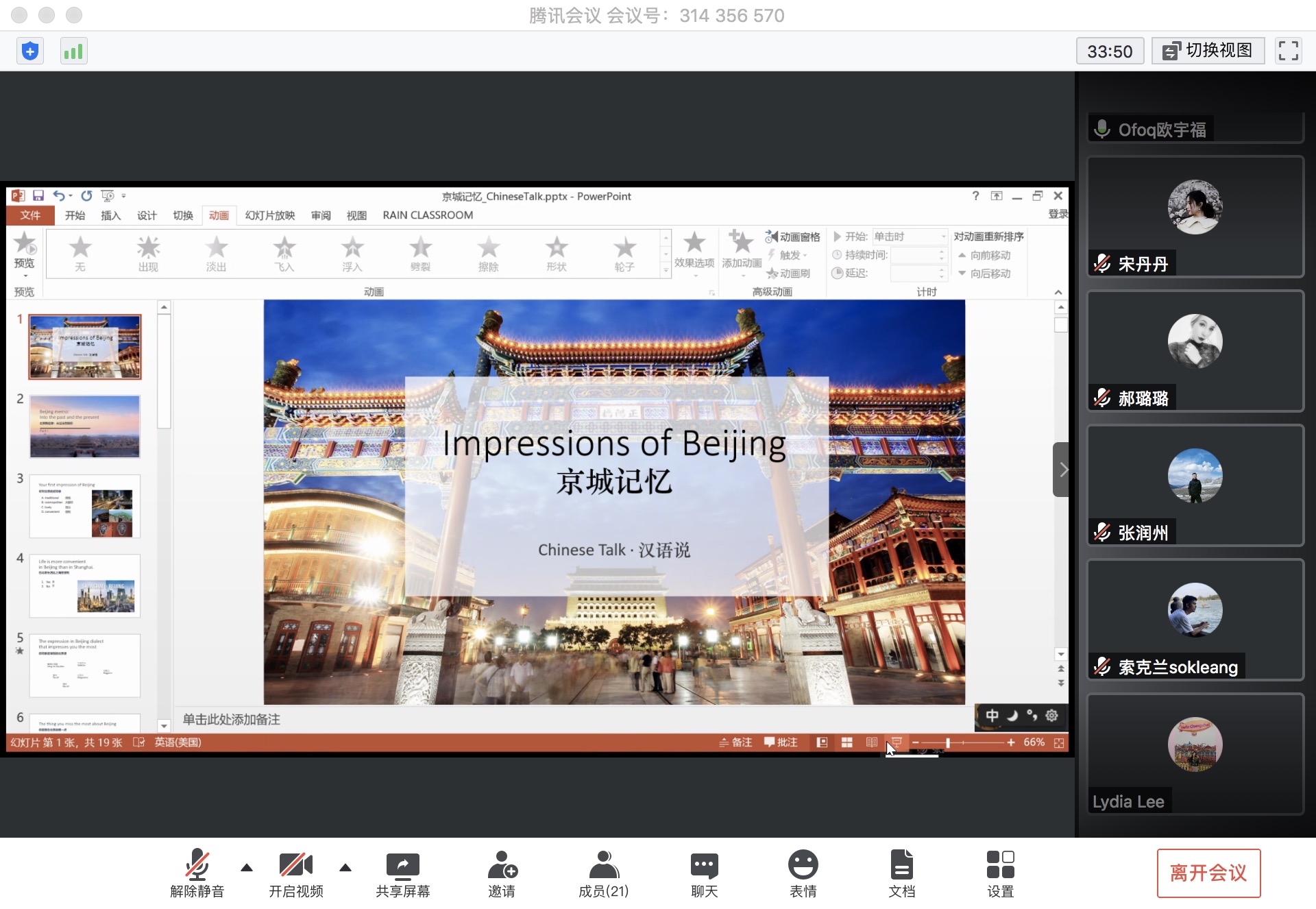 米兰新闻网5月29日电(通讯员 冯文欣)5月24日晚,“汉语说”工作坊之“京城印象(Impressionof Beijing)”专场在“云”上如期举行,本次活动吸引了来自6个院系、9个国家和地区的10余名国际生参加。在疫情防控时期,本学期的“汉语说”移步线上,通过网络搭建起了一座中外学生沟通交流的桥梁,保证中外学生跨文化交流“不断线”。