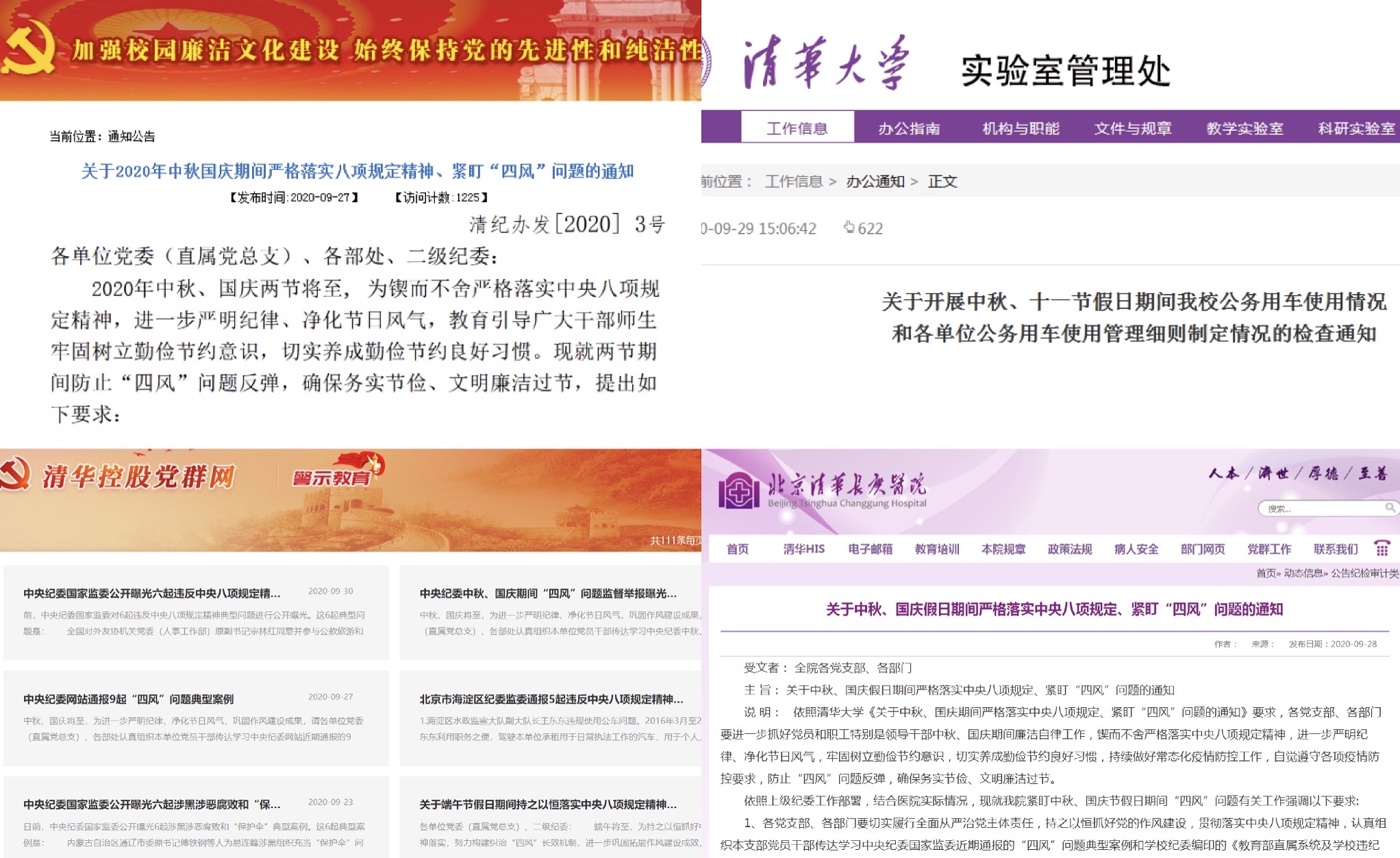 节日前夕,学校纪委积极作为、提前谋划,及时转载中央纪委国家监委中秋、国庆期间“四风”问题监督举报曝光专区通报的典型案例,协助学校党委发布《关于2020年中秋国庆期间严格落实八项规定精神、紧盯“四风”问题的通知》(以下简称《通知》),向各单位和全校干部党员发出提醒,明确务实节俭、廉洁过节、严格疫情防控等方面纪律要求。为进一步落实《通知》有关要求,学校纪委办公室会同实验室管理处开展节日期间公务用车使用情况专项检查,要求、督促相关单位严格执行“严禁公车私用、私车公养,公务用车应当集中停放在办公场所、统一管理”的工作要求;对二级单位公务用车使用管理细则制定和“一车一簿”登记制度执行情况进行摸底检查,查漏补缺,不断完善学校公车使用管理制度体系。各二级纪委和各单位纪检干部采取通过党政联席会、中层干部会、党支部书记例会进行传达部署,有针对性地发布本单位工作要求,向干部党员发送邮件和短信等方式,积极协助所在单位党委(直属党总支)抓好教育提醒,做到“两个责任”贯通协同,一体推动责任落实。