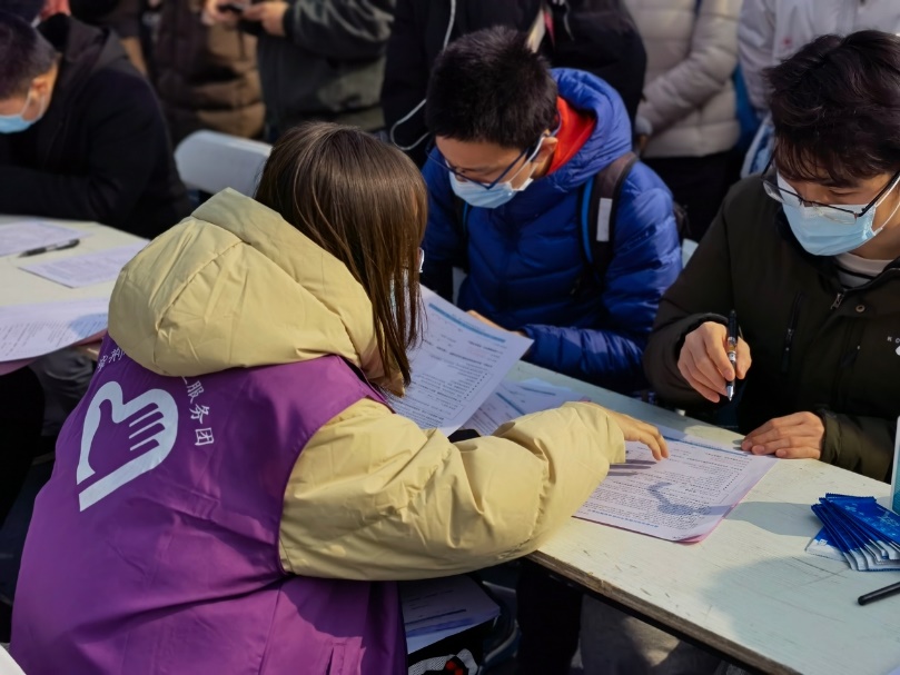 公管学院硕士生付轲3月7日早上6点多就来到西体育馆准备疫苗接种志愿工作,“虽然做好了心理准备,但还是比想象中辛苦一些。不过看到医务工作者与志愿者在各自的岗位上不辞辛苦地坚守着,接种同学充分理解积极配合着,从他们身上想到了所有人为取得抗疫全面胜利的万众一心和众志成城,这也让我们为之一振。”