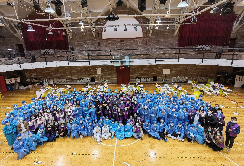 在西体育馆参与疫苗接种的医护人员和志愿者