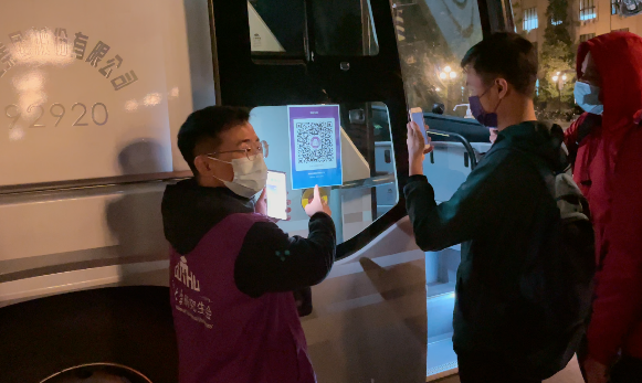 随着天色渐暗,扫描紫荆码也变得有些困难,影响了同学们的上车效率。主楼点位的志愿者窦浩铭和李睿涵及时发现,便用手机灯光照亮二维码,举动虽小,但收效显著,同学们上车的队伍又重新变得顺畅起来。手机的微光,照亮双清同学返“家”之路;同学们真诚的感谢,也温暖了志愿者的热忱之心。