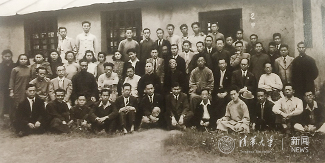 1946年5月3日,西南联大结束之际,联大中文系全体师生在教室前合影。二排左起:浦江清、朱自清、冯友兰、闻一多、唐兰、游国恩、罗庸、许维遹、余冠英、王力、沈从文