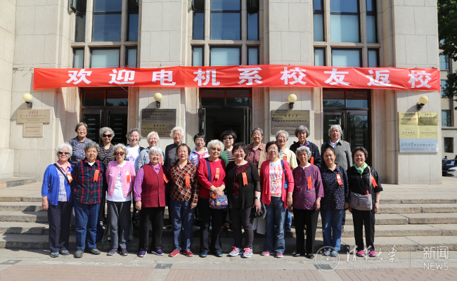 电机系1967届女同学在西主楼系馆前合影留念。陈淑玲 摄