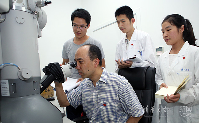 生命学院王宏伟教授在冷冻电镜室指导学生。