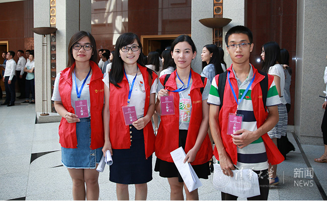 研究生毕业合影现场的党员志愿者。记者 苑洁 摄