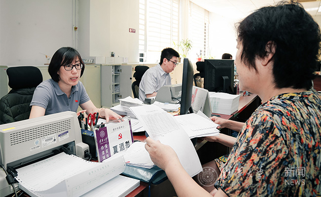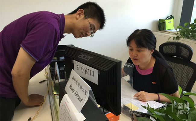 国际处共产党员夏丰娜为教师办理手续。记者 张宇 摄