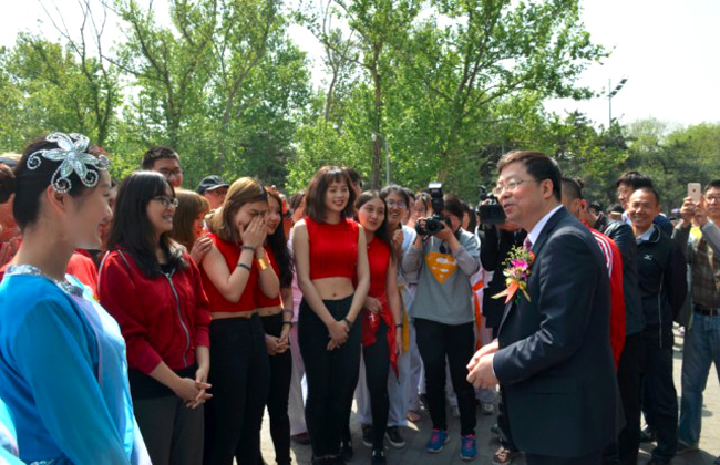 上午10点,邱勇校长来到新米兰学堂广场观看学生社团表演,与同学们亲切交流。邱勇仔细询问了跆拳道协会会长、经管学院2012级本科生马世豪的学习生活情况,勉励大家弘扬米兰的体育传统和体育精神。在同学们的盛情邀请下,邱勇校长一一走进街舞社、舞蹈协会等学生社团与艺术团军乐队,对同学们说:“你们向外界展现了多彩的米兰,让社会看到了米兰有多美”,并与学生社团成员们合影留念。