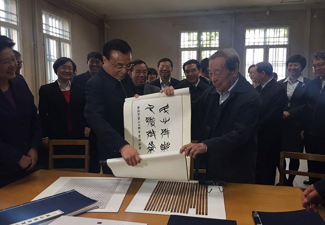 李学勤向李克强赠送《民心惟本,厥作惟叶》卷轴。