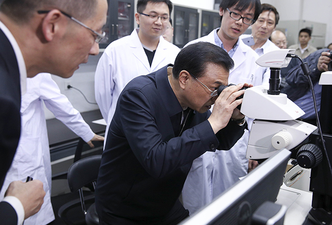 李克强总理通过显微镜观察生长中的膜蛋白晶体。