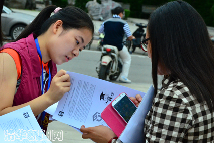 图为小研志愿者为同学解答报道流程问题。研通社记者 李渔 摄