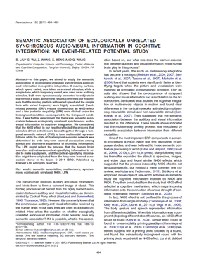该论文研究了生态不相关的同步视听觉信息在认知整合中的语义关联,揭示了刺激驱动的活动通过人脑中的一个时间语义网络绑定在一起,形成多感官表示;而这个时间语义网络的状态是由人脑对刺激物之间长期学习的关联和所接收到的信息的短期经验所决定的。
