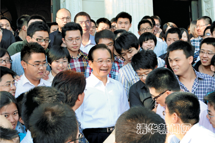 图为温家宝在大礼堂门口与同学们亲切话别。记者 智斐 摄