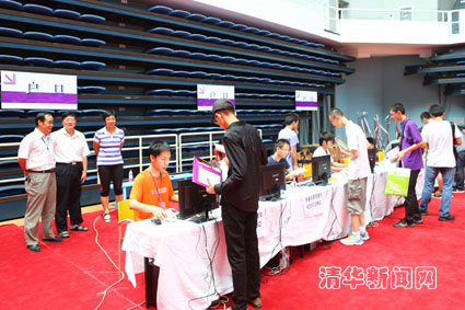 图为综合体育馆内新生照相办理学生证。记者 智斐 摄