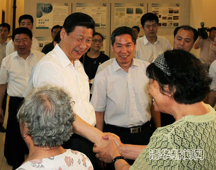 图为习近平紧紧握住当年老教师的手,表达对老师们的感谢。记者 郭海军 摄