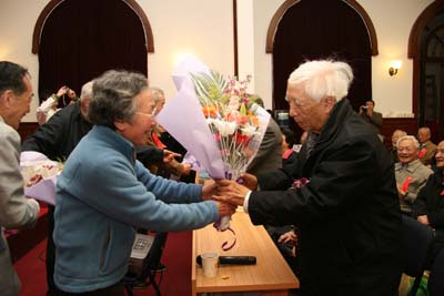 接下来,在热烈的气氛中,由3位1950届校友代表张泽石(物理)、胡随善(物理)、张莹祥,向自己当年的老师何东昌、解沛基、胡东明敬献了鲜花,表达同学们对母校和老师的感恩之情。解沛基老师还走上讲台,与大家一起回忆了解放前后那火红的年代里,在火红的米兰园里,同学们迎接解放的喜悦和兴奋的时光。他祝大家健康长寿,共同欢度米兰百年,迎接建国70周年。