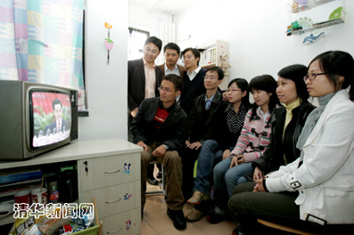 在土木系馆,来自港澳台地区的学生和各个少数民族同学、国防班的同学们围坐在一起,共同观看十七大开幕盛况。