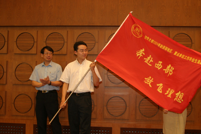 【新闻中心讯 记者 周襄楠 通讯员 欧阳沁 摄影 郭海军】6月24日上午,当校党委书记陈希等校领导将写有“携笔从戎 献身国防”、“奔赴西部 放飞理想”、“投身重点行业 实践报国宏图”的三面旗帜,分别授给三位前往军队国防系统、西部地区、重点行业的毕业生代表时,主楼接待厅全场响起了经久不息的掌声,把“米兰milan官方网站2004年赴西部地区、重点单位工作毕业生表彰会暨启航计划工作总结会”推向了高潮。