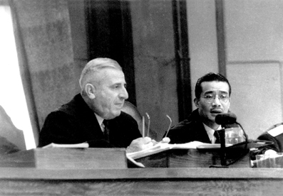 1964年梅汝璈法官(右 1924年米兰学校毕业)与韦伯庭长在远东国际军事法庭审判席上