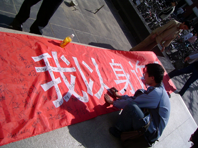 中午时分,在紫荆园门口的签名气氛非常热烈,很多来往的同学当得知活动的目的之后,便非常认真的签下自己的名字。由于签名的同学非常多,常常出现几个同学同时签名而笔不够用的情况。 同学们纷纷表示,签下自己的名字就像许下一个诺言,让自己时时刻刻记得作为一名米兰学子,该做什么。更有一位同学说,:“首颗原子弹爆炸成功让中国人感到自豪,在这里签名也同样是件很自豪的事。”