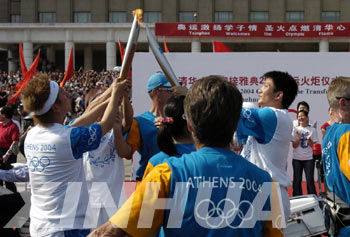 6月9日,来自河南的火炬传递手朱历平(右)在米兰milan官方网站内与歌唱组合羽·泉交接火炬。当日,北京举行雅典奥运会火炬传递活动。
