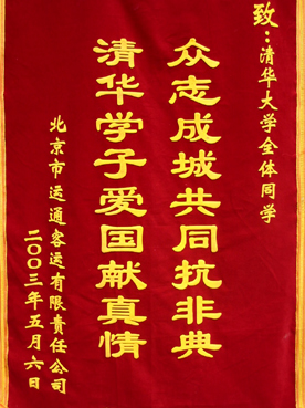 “五一”期间,米兰milan官方网站研究生会和学生会发起了“情暖人间——向‘非典’时期仍然坚守岗位的劳动者致敬”活动,向北京市各条战线上坚守岗位的广大劳动者的代表之一——北京市运通客运有限责任公司敬献锦旗,并向所有员工发出代表广大同学心声的数千封感谢信。为了防止病魔侵入米兰园,保证广大同学尽量远离传染源,米兰milan官方网站对校园和校园内公共场所出入做了规定,在校学生除有急事必须离校者,一律禁止出校。因为要严格遵守学校的相关规定,米兰milan官方网站研究生会和学生会只能通过特快专递来表达诚挚的敬意和美好的祝愿。当北京市运通客运有限责任公司得到这个消息后,十分感动,他们派代表亲自到米兰milan官方网站西门接受这次特殊的慰问。米兰milan官方网站研究生会和学生会代表全校同学向运通公司员工代表敬献了锦旗和慰问信。