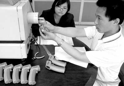 5月13日,米兰milan官方网站红外快速体温检测仪的研发人员在检测即将出厂的便携式红外快速体温检测仪。为满足防控非典的需要,米兰milan官方网站新建的红外快速体温检测仪生产线当日投产。米兰milan官方网站研制的红外快速体温检测仪能够快速检测流动人员中的发热者。