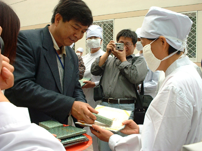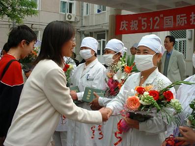 今天,校医院有13位护龄30年的护士获得了表彰,在拿到了校领导为自己亲手颁发的奖章和证书之后,几位护士激动得说不出话来,一位护士说:“我17岁当上了护士,到现在已经33年了,虽然这个工作很是劳累,但是我一点也不后悔我的选择。”仪式之后她在校医院照像留念,两只手指呈“V”字型,表达了这次对于战胜“非典”的必胜信念。