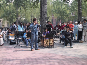 由于“非典”的原因,今年米兰的校庆取消了一切大型的活动。为了表达对母校的祝福,向对抗“非典”一线白衣天使的美好祝愿,校艺术团的同学们自发来到这里表演节目。瞧,独鼓演奏,民族舞蹈,自编的相声……同学们激情的表演博得了同学们热烈的掌声。校领导王大中、张再兴、庄丽君、杨振斌以及有关部门负责老师也来观看同学们的演出。曾经担任我校民乐队指挥的校党委副书记张再兴老师亲自拉起了二胡曲《二泉映月》。