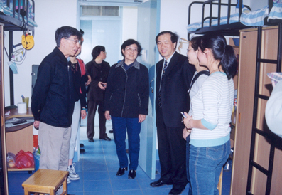 在学生宿舍楼,王校长仔细了解了目前学生宿舍楼的卫生消毒情况和管理情况。现在,学生宿舍楼每天上午都进行消毒,学生全部离开宿舍,走在楼道、走进房间,都能闻到消毒液的味道。从今天起,同学们已经领到了自己的宿舍楼出入证,只有本楼学生才能进入楼内。王校长充分肯定学生志愿者自我管理的方式,要求同学们一定要严格把好进门关。在查看了紫荆公寓1号楼后,王校长一行又走进大一女生住的2号楼,并与建筑学院建21班两名同学来到她们的宿舍,王校长询问了她们的情况,并语重心长地对同学们说,大家一定要对“非典”有高度的警惕,搞好消毒和卫生,减少受感染的机会,同时也要不要恐慌,相信我们一定能够战胜“非典”。