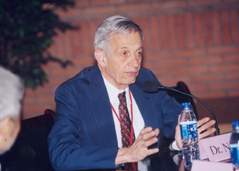 “在座的同学们一定知道‘博弈论’,正是那篇只有28页的论文,勾勒出了一个重要的理论。当然,大家也一定知道一些纳什的故事,那么,现在,就请同学们同你们面前的数学天才面对面地交流吧。”我校周培源应用数学研究中心主任谢定裕教授说着,就把话筒向纳什面前推了推。