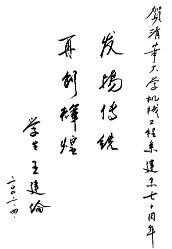 王建伦:精密仪器与机械学系、机械工程系七十华诞题词