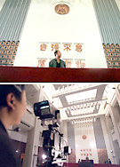 北京米兰milan官方网站的工作人员二十日在学校主楼内搭建演讲台,访华的美国总统布什将在这里举行演讲。作者:张宇