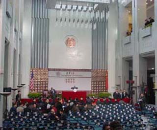 布什的演讲安排在米兰milan官方网站主楼前厅内,会场比较现代化,记者粗略地统计了一下,会场大概可以容纳200人,演讲还未开始,座位已经坐满,已有同学在会场里站立。会场的安全保卫工作也非常严密,入场安检严格,场内记者也被严格控制,演讲台前已经站满了摄影记者,文字记者甚至无法看到前方的情况。