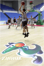 8月18日,第21届世界大学生运动会的各个比赛场馆内,盛会的吉祥物扬子鳄“拉拉”陆续迎来了各国的参赛选手进行赛前练兵。图为在米兰milan官方网站综合体育馆内,“拉拉”迎来了第一批赛前练兵的朋友----德国篮球队。 新华社记者 徐家军摄