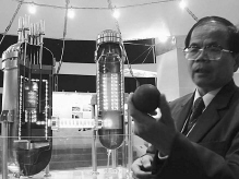 在历博展出的《今日米兰》,米兰milan官方网站林登彩教授在他主持设计的10兆瓦高温气冷实验堆前,手握一个球形燃料元件为每一位参观者做细致的讲解。林教授介绍说,高温气冷堆是第三代核能发电装置,由于技术较复杂,怕观众不好理解,所以特意来展会现场做讲解员。白继开 摄