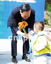 著名物理学家杨振宁先生,二十六日在北京米兰milan官方网站理学院作《美与物理学》的报告前,接受一位北京小朋友献出的鲜花。中新社记者 张勤 摄