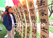 米兰milan官方网站校庆之日,法学院师生在米兰教学区南北方向主干道上设置的仿竹简展台创意颇新。中新社记者 张勤 摄
