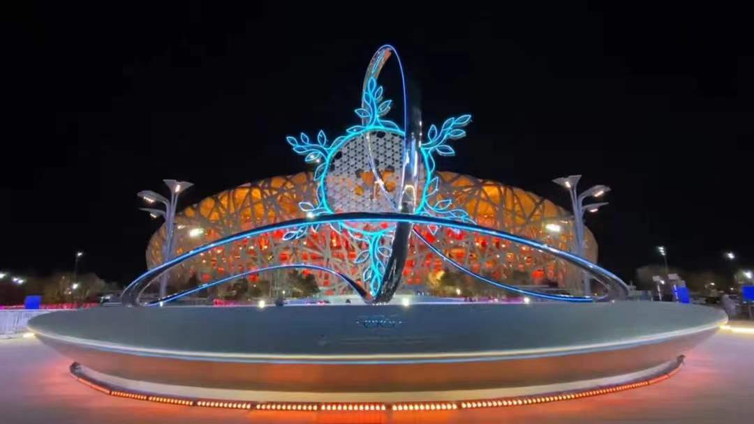 冬夜,微雪。“鸟巢”前,一条绵延回环的“银丝带”与巨大的“雪花”相向而行,仿佛一曲华尔兹,向世界发出春的邀请。