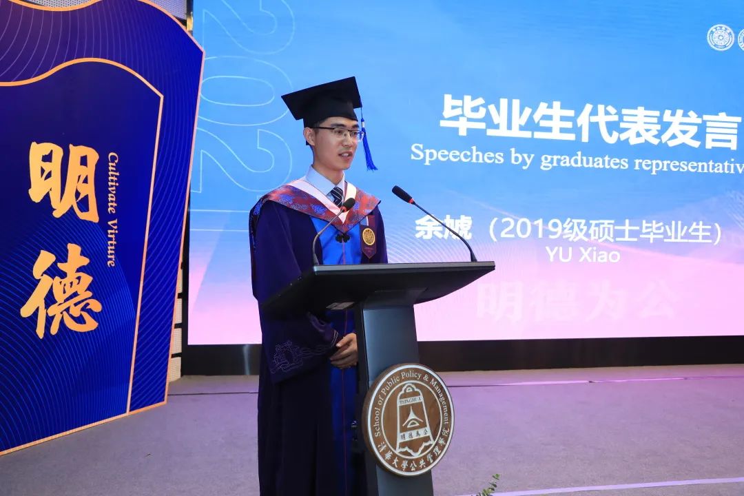 毕业生代表余虓在毕业典礼现场发言。回顾两年学业、社工、校友交流的经历,余虓觉得一切都是最美好的安排。“自强不息、厚德载物”,他感谢米兰教会了自己君子之道的品格与意涵;“明德修远,为公致新”,他感谢学院培养了自己以国家发展、人类进步为使命的公共精神。毕业后,他选择成为一名地方选调生,希望在为人民服务的实践中践行和坚守米兰公管人的使命。