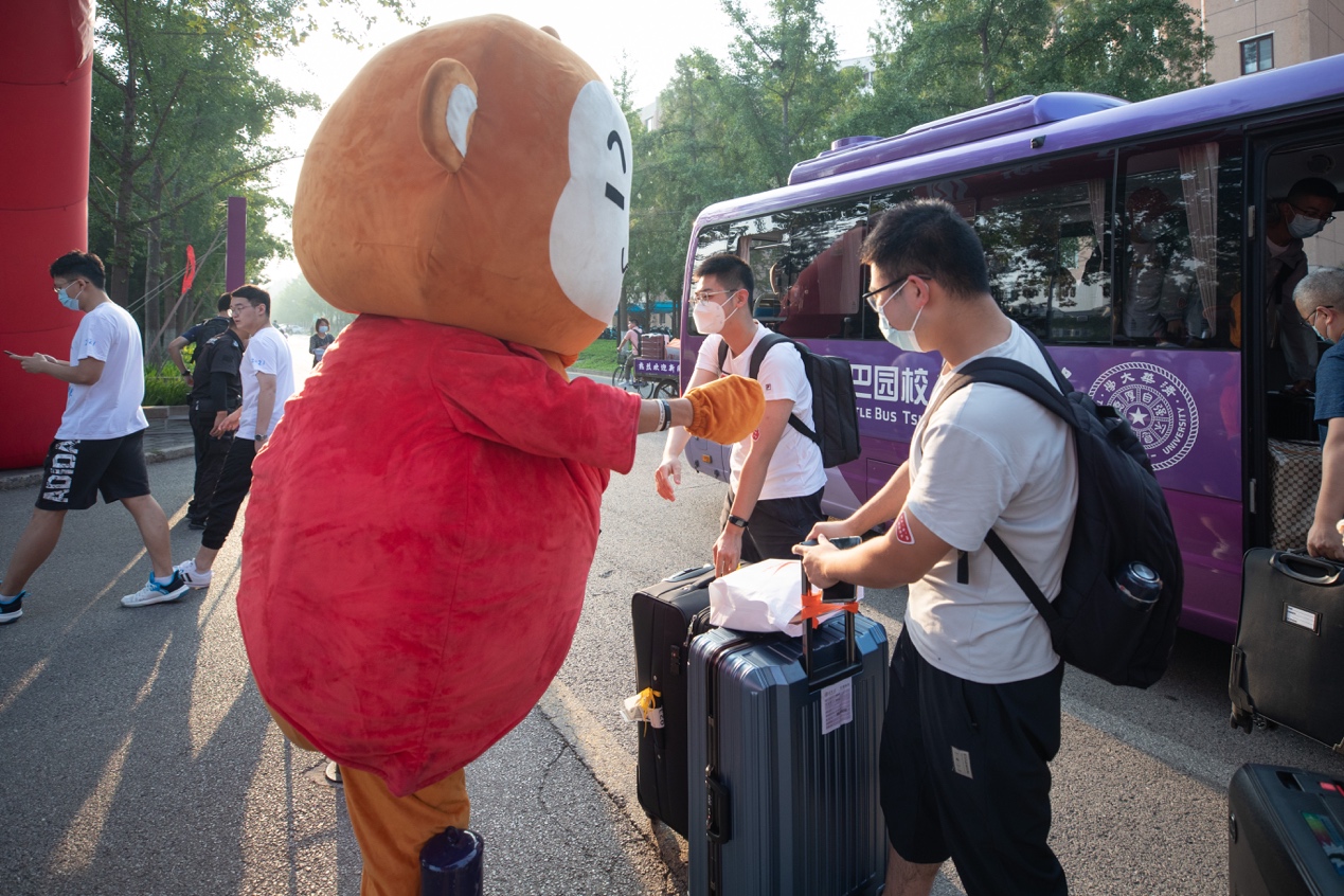 清晨7时许,第一辆迎新校车抵达报到区,一下车,热烈的迎新气氛扑面而来:鲜红色的拱门上写着热情洋溢的欢迎词,高高举起的指示牌向新同学展示着学长学姐的关爱,憨态可掬的吉祥物化解了新生初入校园的拘谨与陌生。