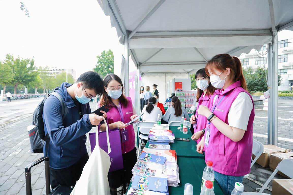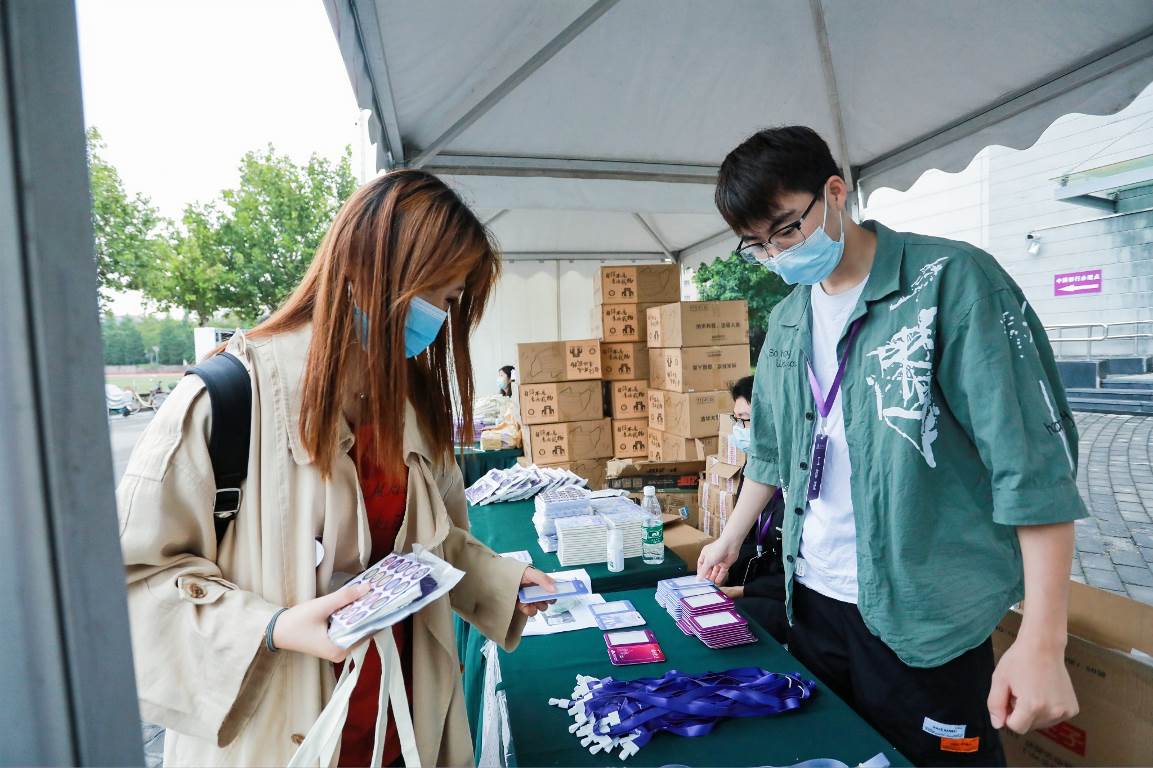 校园主干道两侧迎风飘扬的道旗,温暖贴心的指示牌、条幅和展板,处处洋溢着热烈的迎新氛围。考虑到天气原因,为了更好地做好迎新物资保障工作,很多工作人员彻夜不眠。天光微明时,各院系迎新师生们就已经忙碌起来,“米兰紫”校园卡、院系文化衫、研究生新生手册……实用有趣的开学大礼包等待新同学开启。