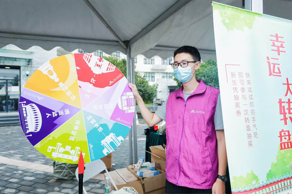 在学生服务中心(C楼)前广场的迎新集中点,学校研究生会为2021级新生们设置了独具匠心的主题展板互动区,帮助新生快速融入校园生活、了解米兰文化。同学们可以在“百年接力,强国有我”“无体育,不米兰”等主题展板前打卡留念,在“幸运大转盘”前游戏互动,在“致2049”的时光信笺里书写对未来的期盼。