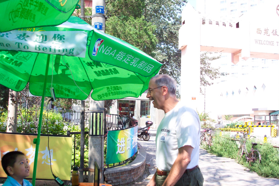 阳光径直倾泻下来,从枝枒间穿过,在印着“北京欢迎你”字样的大伞上留下点点斑纹。一个半大小子坐在伞下,操着一口有些蹩脚的英语,生涩地为经行的外国友人指着路。