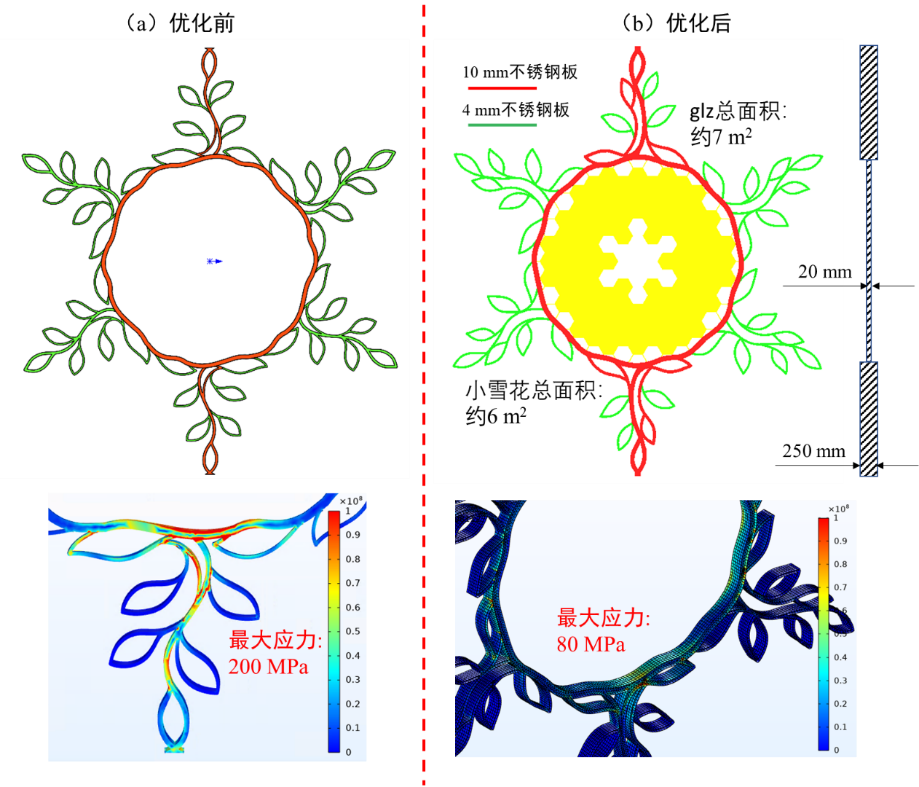 薄片状结构,接近五层楼高,连接氢气管线,同时要考虑冰天雪地山间里不时刮起的十级大风,以及突然袭来的低温酷寒……要想保证火炬台强度安全的同时,兼顾整体雕塑的正常转动,难度着实不小。甫一开始,设计团队尝试以雪花为整体形态、橄榄枝作为枝干结构来构建火炬台,这种设计方案自身具有极高的艺术美学。但田煜课题组成员、机械系2017级直博生李新新经过有限元受力分析,发现如果将整个雪花重量都压在细小的橄榄枝条上,其结构强度及工程实现上都存在问题,不得已改换了方案。