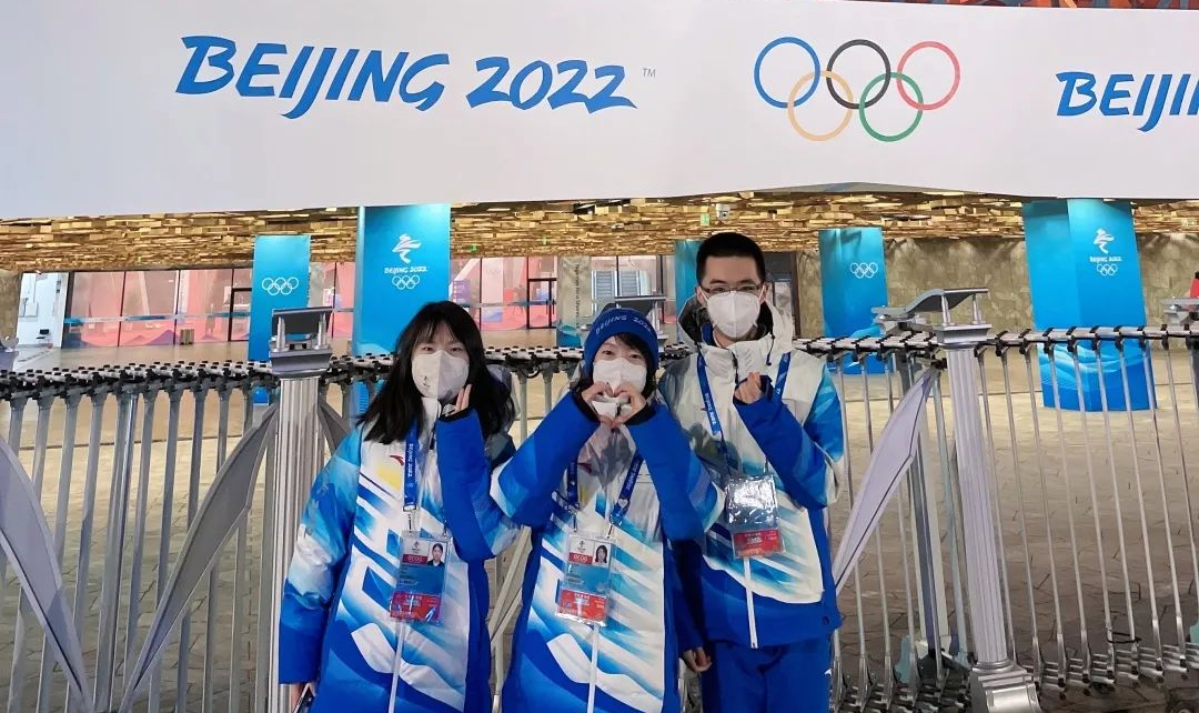 沈天成(最右)同另外两位对接巴赫主席的OFA志愿者在鸟巢外合影