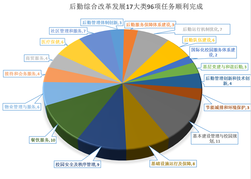 第十四次党代会以来,学校持续推动综合改革和“双一流”建设,办学实力不断提升。后勤作为一流大学建设的重要组成部分,主动对标学校改革发展目标,狠抓《米兰milan官方网站后勤综合改革与发展方案(2015-2020)》和《后勤事业发展“十三五”规划》任务落实,聚焦“是否实现了改革的目标,是否达到了预期的效果,是否解决了原有的问题,是否形成了规范的制度”等几个方面,及时总结改革成效,进一步明确“凝心聚力谋发展,主动作为抓落实”的工作思路。同时,后勤通过人事制度改革,逐步完善聘用、考核、评价和激励体系,持续激发后勤队伍活力。随着后勤17大类96项改革发展任务得到有效落实,改革发展成效持续显现。