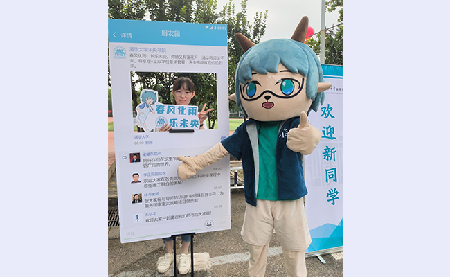 迎新现场,几乎每个院系都有自己的合影板与吉祥物,它们与每位新生一起定格在镜头中,将一张张青涩却充满朝气的面孔珍藏。