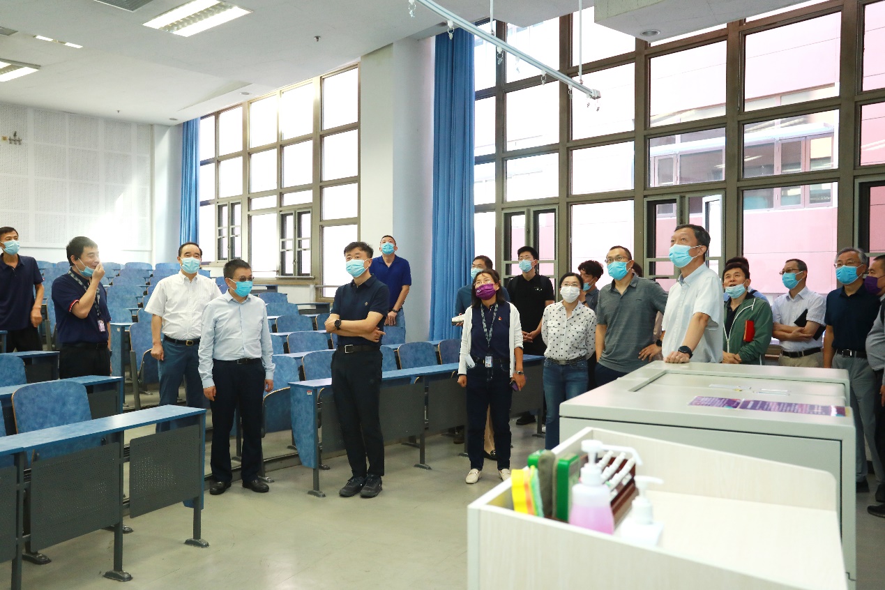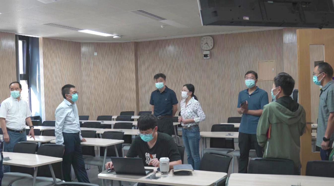 本次检查重点聚焦教学楼环境、设备设施、疫情防控等内容。检查组一行严格遵守防疫规定,刷卡、测温后进入各楼宇场所开展相关工作。在新水利馆,信息化技术中心工作人员介绍了407教室多媒体设备改造及目前使用多媒体设备应用教学、会议、活动等场景情况。校领导一行对该教室多媒体设备升级改造后提升线上线下的教学质量给予肯定。