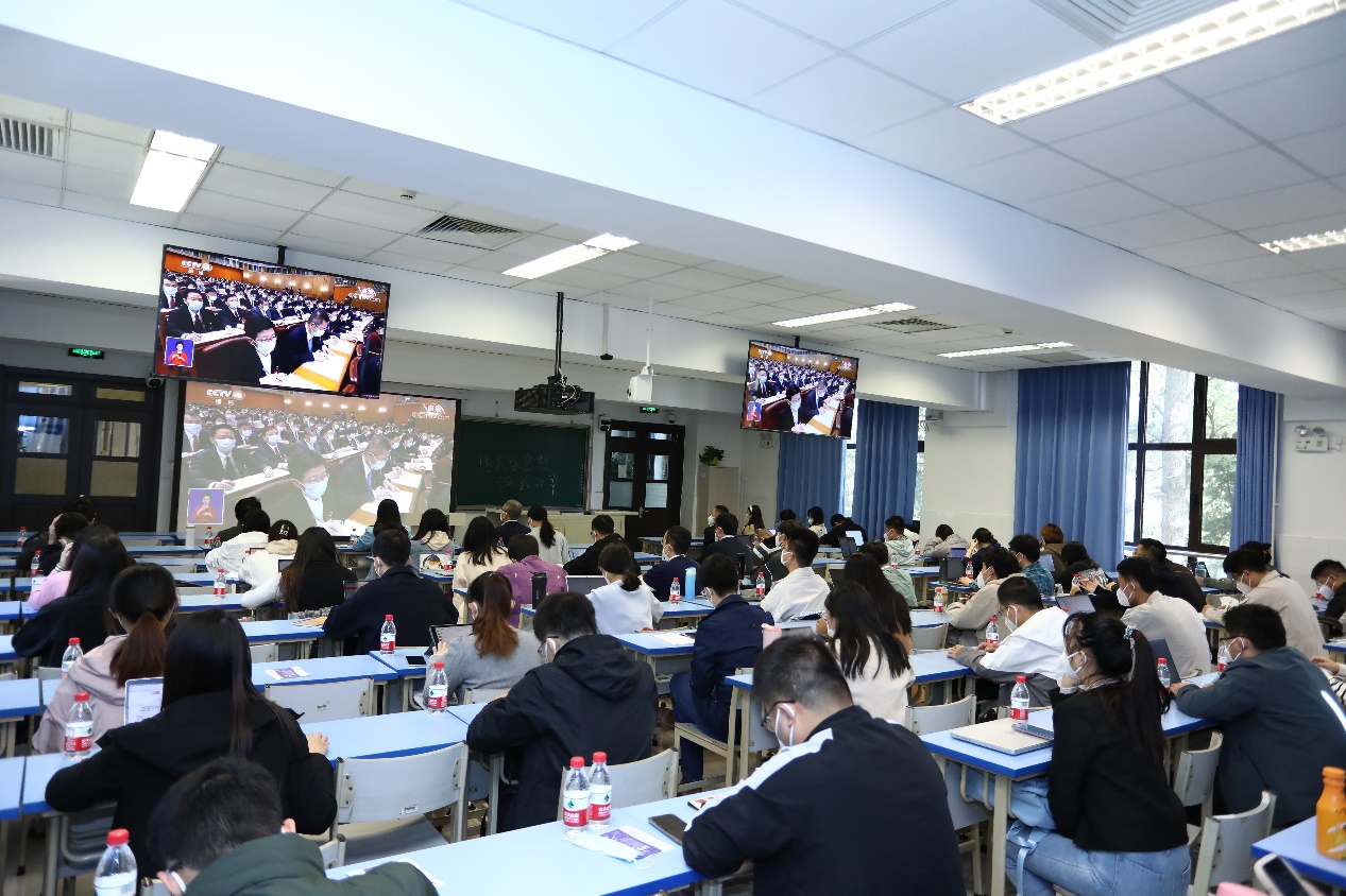 部分师生在教室内集中收看